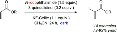 El quimioselectiva α-yodación de diversos ésteres acrílicos simple y multi-funcionalizado se lleva a cabo de manera eficiente por un protocolo de Morita-Baylis-Hillman implica el uso de N-iodophthalimide, 3-quinuclidinol y KF-Celite en acetonitrilo. No degradación de los compuestos obtenidos se observó en las condiciones optimizadas por lo tanto, el suministro de α-iodoacrylates adecuados para las reacciones organometálico (es decir, tipo de acoplamiento Nozaki-Hiyama-Kishi).